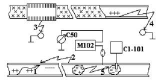 R S - суммарное сопротивление (R S = R 1 + RВК ), включающее переходные сопротивления мест контакта проводов электровзрывной цепи с рельсом R 1 и с грунтом R 2 , а также сопротивление взрывной сети RВК , Ом;