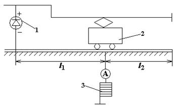 - расстояние между тяговой подстанцией 1 и возможным местом контакта проводов электровзрывной цепи с рельсом штрека, м;