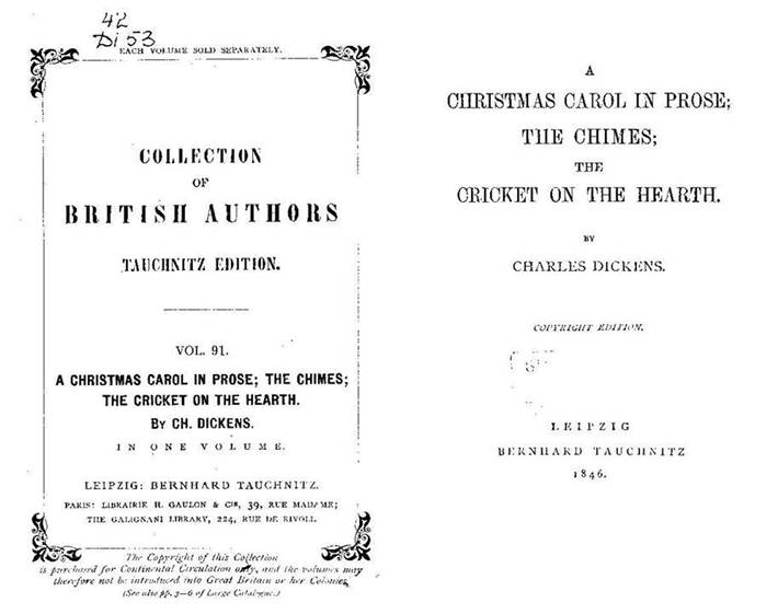 A Christmas Carol in Prose; The Chimes; The Cricket on the Hearth / Dickens Chrles. - Copyright Edition. - Leipzig: Bernhard Tauchnitz, 1846. - (Collection of British Authors. Tauchnitz Edition. Vol. 91).