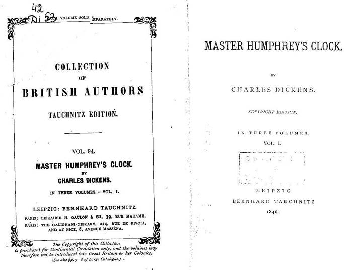Master Humphrey's Clock: In Three Volumes. Vol.2 / Dickens Chrles. - Copyright Edition. - Leipzig: Bernhard Tauchnitz, 1846. - 415 p. - (Collection of British Authors. Tauchnitz Edition. Vol. 95).