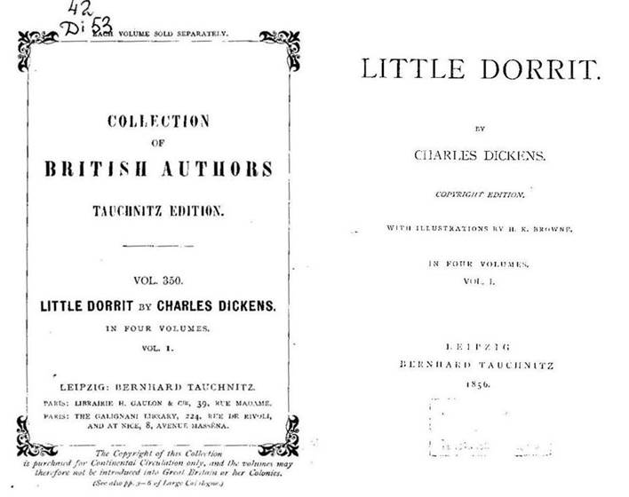 Little Dorrit: In Four Volumes. Vol.1 / Dickens Chrles. - Copyright Edition. - Leipzig: Bernhard Tauchnitz, 1856. - 322 p. - (Collection of British Authors. Tauchnitz Edition. Vol. 350).