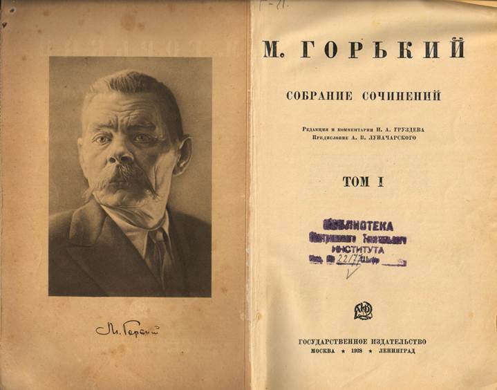 В ценном фонде научной библиотеки хранятся несколько изданий собраний сочинений М. Горького, множество его литературных и публицистических произведений, малую часть которых мы представляем на данной выставке.