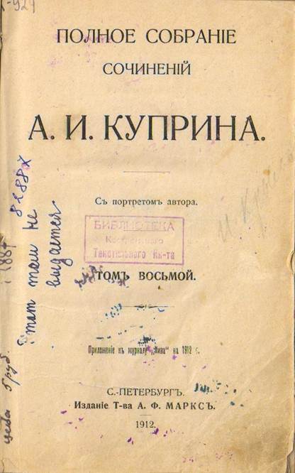 К сожалению, в библиотеке сохранился лишь один том Полного собрания сочинений А.И. Куприна 1912 года, изданный при его жизни и который представлен нами на следующей странице. Оригинальная обложка была утрачена, поэтому на слайде – только титульный лист издания.