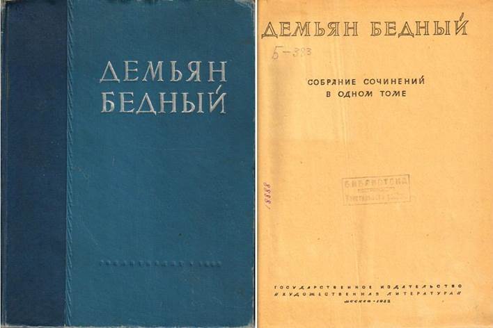На нашей выставке представлено Собрание сочинений Демьяна Бедного, вышедшее в 1937 году.
