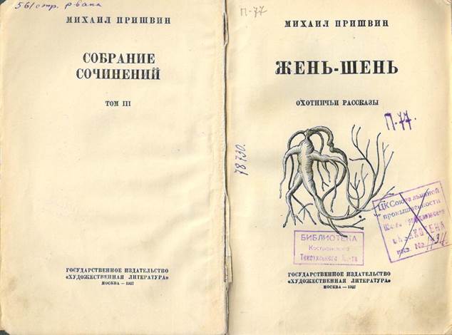 Собрание сочинений: В 4-х т. Т.3: Жень-шень; Охотничьи рассказы / Пришвин Михаил Михайлович. – Москва: Худож. лит., 1937. – 679 с.