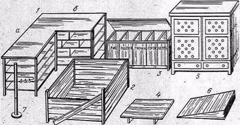 1. — стеллажи (а — потолочные, б — клеточные сборные);