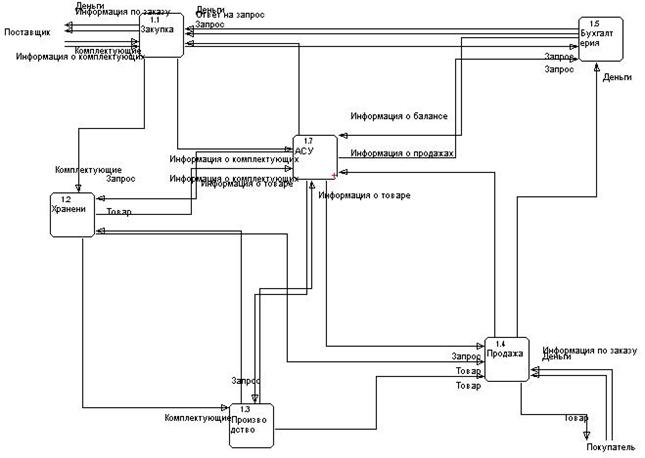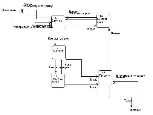 После этого следуют процессы хранения и производства . Закупленные комплектующие поступают для хранения на склад; со склада комплектующие извлекаются на производство готовой продукции (микроузлов). Также со склада извлекается необходимое количество готового товара для продажи . Произведённый товар возвращается для хранения на склад либо этот товар сразу идёт на продажу.