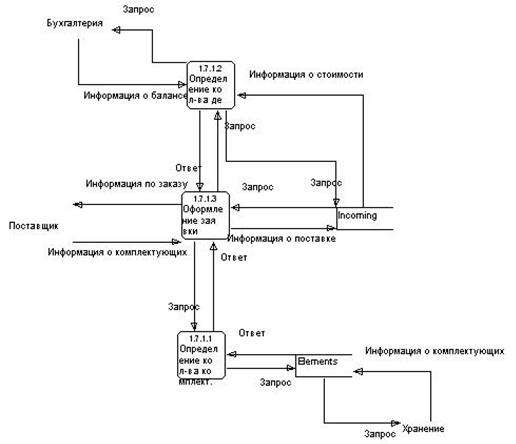 Процесс закупки начинается с подачи запроса в бухгалтерию о наличии средств. Из бухгалтерии приходит ответ на запрос и, если необходимые средства есть в наличии, то деньги . Затем происходит процесс получения от поставщика информации о комплектующих и отправления ему информации по заказу и денег (соответствующей оплаты), после чего компания НПФ «Микротехнология» получает в свое распоряжение закупаемые комплектующие .