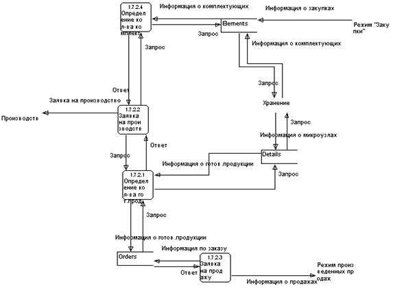 В режиме «Текущее состояние» происходят процессы: «Определение количества комплектующих», «Заявка на производство», «Определение количества готовой продукции», «Заявка на продажу» (см. рис. 7). Для определения наличия готовой продукции на складе производится запрос к таблице базы данных Details , информация о заказах на продажу готовой продукции хранится в таблице Orders .