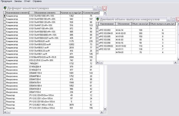 Рис. 13 . Отчет о дефиците комплектующих ЭРЭ и дневном объеме выпуска микроузлов