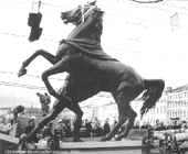 Еще в 1833 году мастер анималистической скульптуры Петр Карлович Клодт представил в Академии художеств гипсовые модели двух групп. Первая - юноша в движении навстречу вздыбившемуся коню, вторая - гордо шагающий рядом с укрощенным животным водничий. Скульптуры готовились украсить пристань на Неве. Но, уже отлитые в бронзе, в 1840-м заняли место на западных устоях Аничкова моста, перестроенного окончательно. На восточных расположились их гипсовые копии. Готовящиеся им на замену бронзовые отправились в Берлин - подарок Николая I прусскому королю. Еще одна пара в 1846-м была перевезена в Неаполь в королевский сад. Клодт к тому времени создал новые скульптурные группы. И с 1850-го они заняли место на Аничковом мосту. Но два раза кони сошли с постаментов. В 1941-м в котлованы Аничкова сада - от бомбежек. И в 2000-м - на реставрацию.