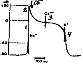 Рис. 2. Потенциал действия одиночной клетки миокарда желудочка: 1 - быстрая деполяризация; 2 - начальная быстрая реполяризация; 3 - медленная реполяризация (плато); 4 - конечная быстрая реполяризация.