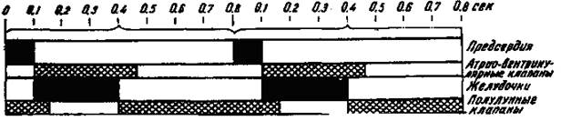 АРП - фаза абсолютной рефрактерности; ОРП - фаза относительной рефрактерности; СН - фаза экзальтации. Цифрами обозначена длительность фаз сердечного цикла и возбудимости.
