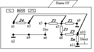 1. Установить на универсальной панели (ПУЛАР) плату операционного усилителя (ОУ). Включить питание ПУЛАРа. Проверить вольтметром и при необходимости установить нужную величину напряжений питания микросхемы. Подать на вход ОУ сигнал с генератора звуковых частот. Измерить коэффициент усиления K операционного усилителя.