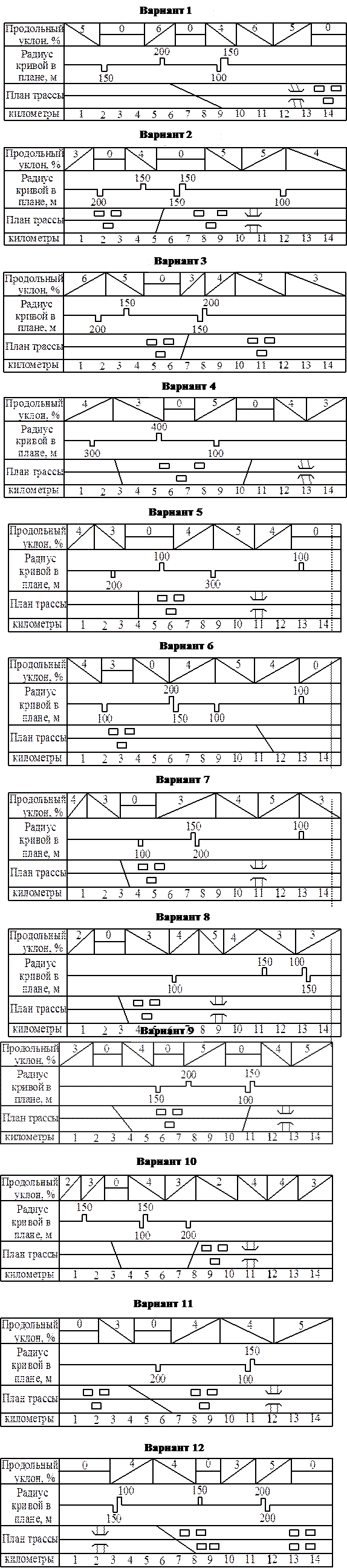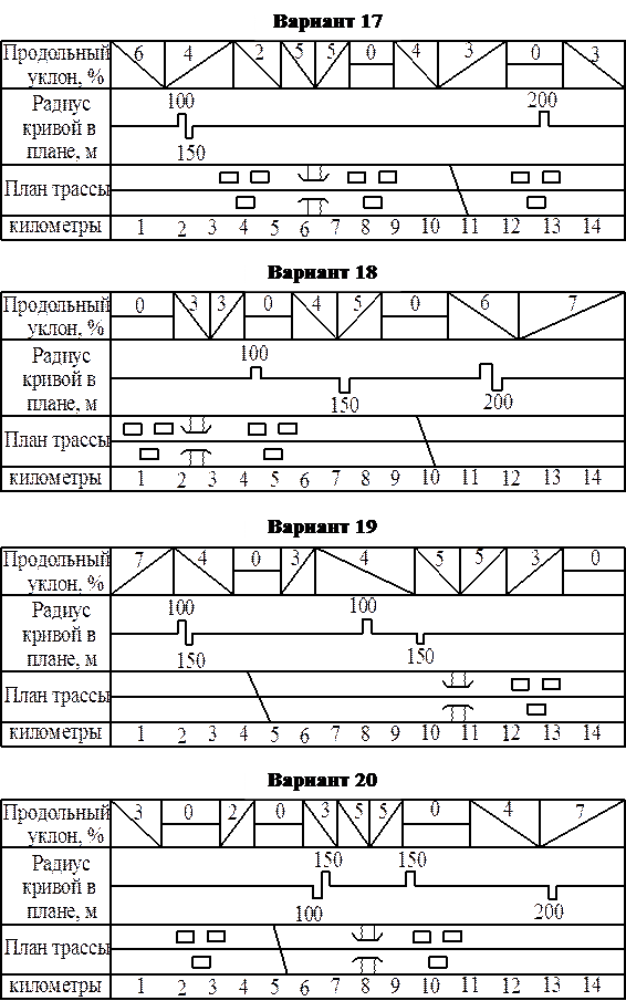 Задание на курсовое проектирование выдается преподавателем индивидуально каждому студенту по номеру студента в списке группы в виде плана трассы с указанием ширины проезжей части, количества полос движения, ширины обочин, величин продольных уклонов, радиусов кривых в плане, интенсивности движения на главной и пересекающих дорогах, длины населенного пункта, длины участков на подходах к населенным пунктам, расстояния от застройки до проезжей части, коэффициента сцепления, приведенных в Приложении Д. Протяженность участка дороги 15 км для всех вариантов.