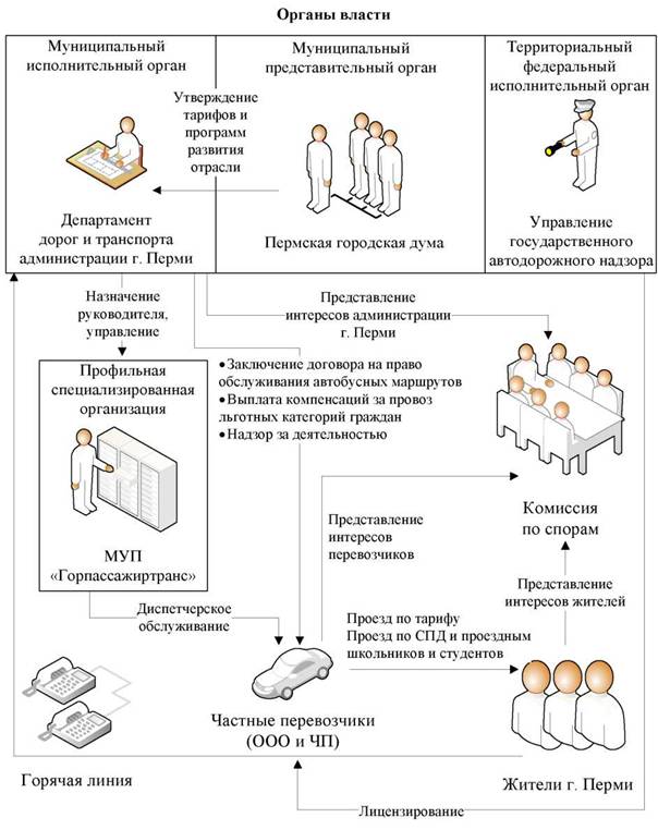 Ключевыми субъектами ЧГП в области транспорта в г. Перми выступают муниципальные органы власти (городская дума; департамент дорог и транспорта), территориальные государственные органы (Управление автодорожного