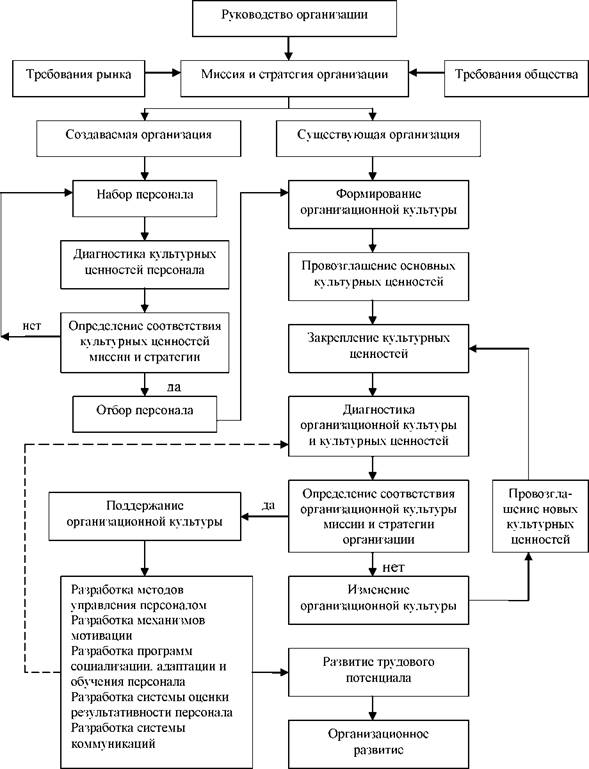 Таким образом, управление организационной культурой представляет собой достаточно сложный процесс, требующий всестороннего и глубокого анализа культуры организации, учета многообразных факторов, воздействующих на организационную культуру, разработки соответствующих механизмов управления ею. При этом целью управления является организационное развитие.