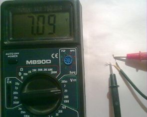 Если прибор показывает значение напряжения, то это свидетельствует о том, что блок зарядного и провод не повреждены. В данном случае прибор показал 7 вольт – это номинальное выходное напряжение данного зарядного устройства. На данном этапе можно сделать вывод о том, что ЗУ не работает по причине нарушения контакта проводников в месте присоединения их к штекеру. Можно убедиться в этом, прозвонив прибором штекер.