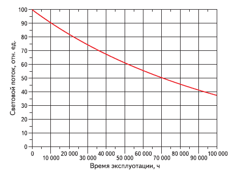 Из графика, изображённого на рисунке 2, видно, что в процессе эксплуатации световой поток светодиода снижается на половину после 50 тысяч часов, а за первые 10 тысяч часов он падает на 10 единиц. Можно сделать вывод, что большой срок службы не подразумевает под собой качественное освещение в период эксплуатации.