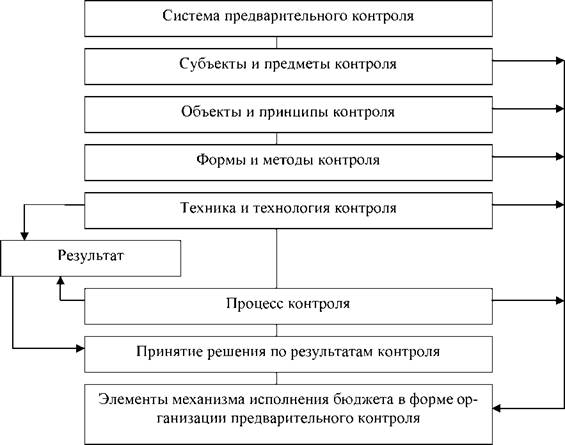 Превентивный контроль за бюджетным расходованием имеет важное значение, поскольку он осуществляется как в процессе составления, рассмотрения, утверждения и распределения лимитов и смет расходов бюджетопользователей, так и проведения расчетов для получения средств из бюджета. Система предварительного контроля представляет собой взаимосвязанную совокупность элементов механизма казначейского исполнения бюджета в форме предварительного контроля и управленческих решений для достижения значимого результата (рис.).