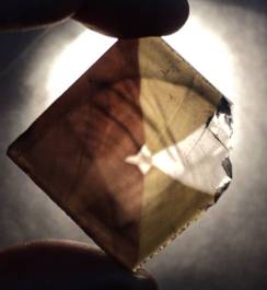 На рис. 3 схематически показан расчет программы GemCad прохождения световых лучей в готовом камне. Можно считать, что компьютерная программа никогда не сможет полностью и правильно рассчитать оптические характеристики объективно воспринимаемые только человеческим глазом, но в данном случае бесспорно указание на следующий факт: лучи вошедшие в камень через левую часть (если о направлениях судить по рисунку) выходят из него через правую и наоборот, в то время как лучи проходящие через центр камня не отражаются от нижних граней вообще и свободно проходят насквозь. В готовом камне это отразилось в виде сильного отражения лучей в узкой части камня (называемой для данной огранки «носом») и почти полном отсутствии отражений в центральной части (рис. 4).