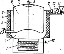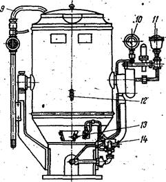 Пищеварочные котлы с косвенным обогревом снабжены контрольно-измерительными приборами и арматурой. К ним относятся: двойной предохранительный клапан 9, манометр 10 (для электрических котлов - электроконтактный), наполнительная воронка 11, кран уровня 12, клапан-турбинка 8.(рис. 2.1)