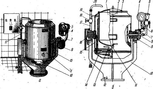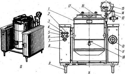 Котел КПЭСМ-60М (рис. 2.6, а, б) секционный модульный опрокидывающийся представляет собой варочный сосуд 1 из нержавеющей стали, подвешенный на тумбах 8 и 11. С внешней стороны к нему приварена обечайка, к которой герметично крепится съемное днище. В днище смонтированы три тэна и электрод защиты тэнов от «сухого хода». Замкнутое пространство между обечайкой с днищем и варочным сосудом заполняется водой и паром, образуя пароводяную рубашку. Рубашка соединена патрубком с узлом контрольно-измерительных приборов: электроконтактным манометром 15, двойным предохранительным клапаном 13, наполнительной воронкой 14. Котел снабжен краном уровня 10.