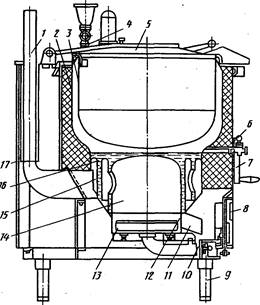 Сверху варочный сосуд закрывается откидной на шарнире двустенной крышкой 18, между двойными стенками которой находится воздушная прослойка. В пазу нижней части крышки имеется прокладка из термостойкой пищевой резины, с помощью которой обеспечивается плотность прилегания. ее к котлу, когда завертываются прижимные болты 19. Крышка уравновешивается пружинным противовесом 8, позволяющим фиксировать ее при открывании в любом положении.