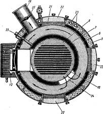 Между наружным корпусом и облицовкой помещена теплоизоляция 3. Для облицовки применяют стальные листы, покрытые светлой эмалью. Котел установлен на постаменте 22.