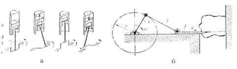 Кривошипно-шатунный (кривошипно-ползунный, кривошипно-кулисный) механизм служит для превращения вращательного движения в возвратно-поступательное (рис. 2.). Механизм состоит из ведущего органа кривошипа 1, который на валу совершает вращательное движение, и шатуна 2, ползуна 3 (б) или кулисы, которые совершают возвратно-поступательное движение. Шатун соединятся с помощью пальца 4 с рабочим органом — поршнем 3 (а). На рис. 2.б дан вариант кривошипно-ползунного механизма, например, в овощерезках.