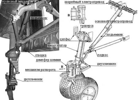 Колеса своими подшипниками устанавливаются на эти оси и закрепляются слева и справа затяжными гайками с последующей контровкой шплинтами. При действии на колеса боковых нагрузок шпиндель поворачивается в корпусе механизма в пределах углов, ограниченных упорами на корпусе. Разворот самолета на земле обеспечивается дифференциальным торможением колес главных опор и свободным ориентированием по направлению движения колес передней опоры.