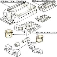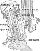 Узлы разъемные и снабжены бронзовыми втулками, к которым подается смазка от масленок. Цапфы входят в эти втулки и прижимаются к корпусу узла крышками на болтах. На нижнем конце штока амортизатора жестко закреплен корпус механизма разворота колес. Внутри корпуса на роликовом подшипнике и бронзовом подпятнике вращается шпиндель, к которому снизу с помощью наклонной трубы присоединяются оси колес (Рис.7.)