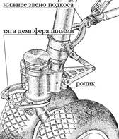 Амортизатор стойки жидкостно-газовый плунжерного типа с иглой. Цилиндр и шток амортизатора связаны между собой двухзвенником, исключающим разворот штока в цилиндре.