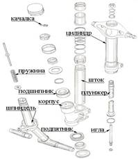 Тяга шпинделя через рычаг вращает валик с подвижными лопатками и перегоняет жидкость из одной полости в другую. Сопротивление жидкости предотвращает развитие автоколебаний типа шимми.