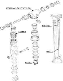 Коническая шестерня редуктора получает вращение от двух независимых электроприводов, один из которых питается от аварийной сети. Вращение шестерен редуктора передается на стальной винт, на котором установлена бронзовая гайка (Рис.12.)
