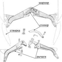 Створки ниши открываются при выпуске и закрываются при уборке стойки. В выпущенном положении створки фиксируются кулисным механизмом, состоящим из двух шарнирно связанных между собой рычагов, концы которых присоединены к створками. В открытом положении створок рычаги запираются подпружиненным стопором, не позволяющим рычагам складываться (Рис.14.)