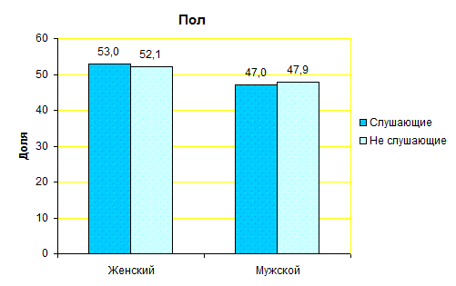 По полу значимой разницы между двумя категориями нет: их распределение приблизительно такое же, как среди всех жителей города (около 53% - женщины и около 47% - мужчины). Учитывая также данные других исследований, нельзя сказать, что пол человека влияет на его склонность к прослушиванию FM-радиостанций.