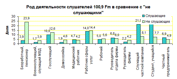 Среди слушателей радио около 14% работников сферы услуг (продавцы, парикмахеры, официанты и пр.), около 10% - госслужащие, около 7% - руководители среднего звена, частные предприниматели. Остальные категории составляют незначительную величину доли аудитории радио.