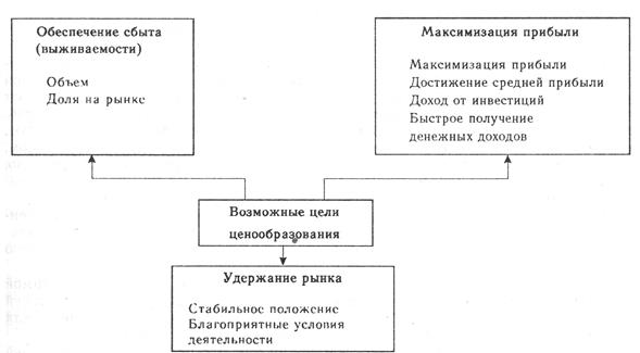 Фирма, прежде всего, выбирает цель, которую в дальнейшем она будет преследовать, выпуская конкретный товар. Если чётко определены цели и положение товара на рынке, то проще и легче сформировать комплекс маркетинга и установить цену. Существуют три основные цели ценовой политики маркетинга: сбыта (выживаемости), максимизация прибыли, удержание рынка. [6]
