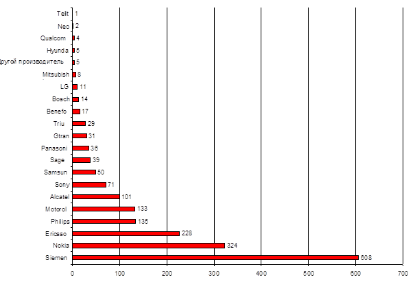 Итак, как можно увидеть из результатов опроса наибольшее предпочтение потребители отдают таким фирмам – производителям как Siemens, Nokia и Ericsson, которые большей частью производят телефоны стандарта GSM900/1800 способные работать с большинством оборудования, как всех московских операторов сотовой связи, так и большинства российских и мировых операторов. Причем, разнообразие моделей, которое варьируется от самых простых и недорогих до самых притязательных позволяет удовлетворить запросы почти всех слоев потребительских масс.