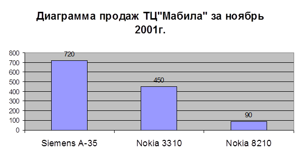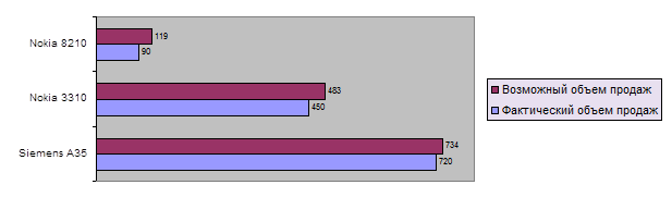 Итак, теперь видно, что наиболее продаваемыми за истекший период были телефоны Siemens A35, что в точности подтверждает предыдущее утверждение о высокой популярности данной фирмы на московском рынке сотовых телефонов. Учитывая молодежный дизайн и сравнительно невысокую цену аппарата можно с уверенностью утверждать о неслучайности результатов данных исследований и предвидеть подобную тенденцию еще как минимум 3-4 месяца до периода так называемой “устареваемости модели”. Говоря о телефонном аппарате Nokia 3310, заметим, что его цена значительно выше цены на телефон Siemens A35, однако высокая популярность данного телефонного аппарата и наличие множества дополнительных функций и развлекательных приложений, совместимых с другими телефонами данной марки удерживают постоянный спрос на этот аппарат. Самая низкая продаваемость, как видно из данных исследования за ноябрь 2001г. у телефонного аппарата Nokia 8210, что обусловлено достаточно высокой ценой на телефон, который не так давно вышел на российский рынок сотовых телефонов и ориентирован на потребителей готовых платить за престиж модели, современный дизайн и большое количество дополнительных функций и графических приложений, а так же за наличие у телефона возможности связи с Internet по средствам встроенного WAP- браузера несколько более высокую цену.