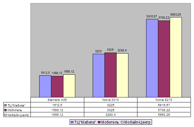 Итак, можно сделать вывод, что основной доход данного торгового центра складывается от продажи недорогих телефонов Siemens A35. Уместно сказать, что формирование цены очень сильно зависит от цен устанавливаемых торговыми точками конкурентов, расположенных на территории центрального административного округа и Москвы в целом. Однако, при формировании цены исследуемого торгового центра, нужно учитывать только ценовую политику конкурентов находящихся в непосредственной близости, т.к. аренда плата за торговые площади на территории центрального округа достаточно высока и это не позволяет ориентироваться на цены, устанавливаемые конкурентами на территориях более отдаленных от центра города. Этот ценовой проигрыш солидно компенсируется выгодным территориальным положением, так как торговый центр расположен на территории так называемого делового центра города, а кроме того, в непосредственной близости от площади трех вокзалов, что обеспечивает торговому центру стабильное количество посетителей в отличие от других, более отдаленных районов города. Итак, проведем сравнение цен исследуемого торгового центра с ценами конкурентов торговые
