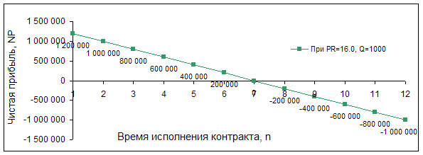 Используя формулу (2), вычислим значения прибыли NP при различном времени исполнения n и представим их в виде графика.