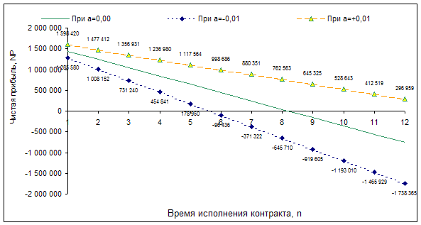 При а= -0.01 экспортер каждый раз при продаже полученной за один период n части выручки в валюте страны-импорта будет получать выручку в национальной валюте на один процент меньше, чем за предыдущий период. Это приводит к уменьшению общей прибыльности сделки и сдвигу графика влево по временной шкале, уменьшая тем самым “временную точку безубыточности” экспортного контракта.