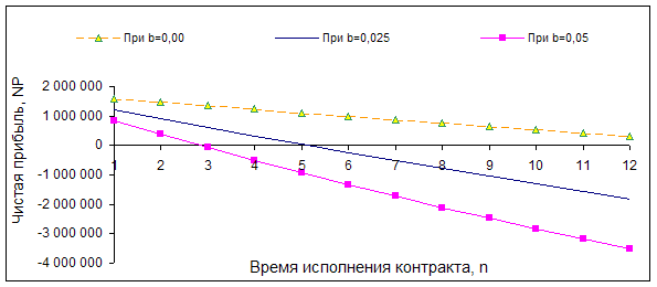 В периоды реформирования экономики инфляция становится одним из важнейших факторов, влияющих на финансовые потоки, формирующие экспортную сделку. Хотя она влияет как на доходы, так и на расходы экспортера, в целом можно сказать, что она негативно влияет на прибыльность экспортной сделки. Рассмотрим зависимость прибыльности сделки от различных значений темпов инфляции b за период на рис. 4.