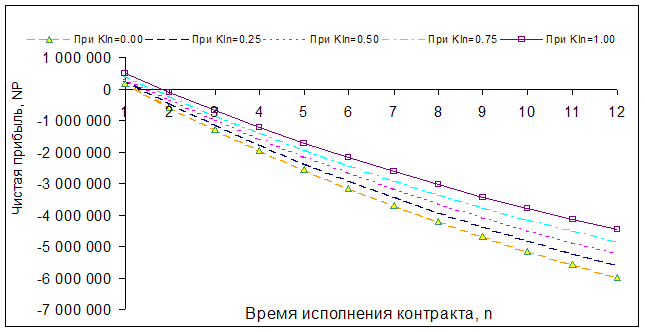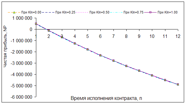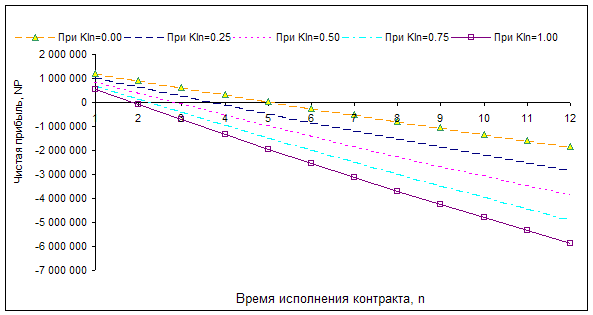 Рис. 7 Зависимость чистой прибыли экспортной сделки NP от времени ее исполнения n при различных коэффициентах заимствования Kln.(RT=0.9, b=0.075, “нулевая” процентная ставка)