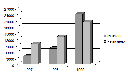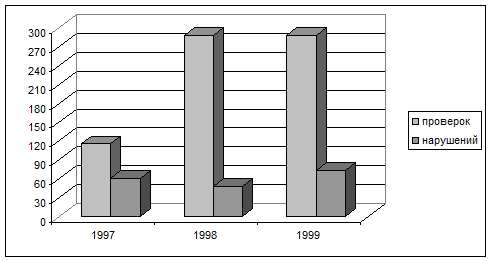 В 1999 г. проведено 289 проверок, из них выявлено 73 нарушения. Доначислено 20245 тыс. руб. из них взыскано 24206 тыс. руб.