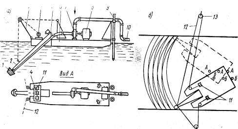 Корпус земснаряда представляет собой разделенный на отсеки понтон 6 (рис. 4.47, а). В его передней части шарнирно укреплена рама 2, несущая на конце фрезу / (на некоторых земснарядах, кроме того, гидромонитор) и грунтозаборник. Фрезу приводят во вращение через систему карданных валов и механических передач от электродвигателя /<, установленного на понтоне. Грунтозаборник сообщается с всасывающим трубопроводом 5, которым пульпа подается к землесосу 7 и далее в пульповод 10, проложенный по водоему на поплавках и по суше на инвентарных опорах. В зависимости от глубины разработки раму 2 опускают и поднимают лебедкой 4 посредством полиспаста, верхние блоки которого закреплены на стойке 3. Для работы на водоеме земснаряд устанавливают на одну из двух расположенных в его кормовой части свай 9. Канаты 12 лебедок 11 (рис. 4.47, б) бокового (па-пильонажного) перемещения оттягивают в стороны от земснаряда и заякоривают на дне водоема, а если позволяет длина канатов, огибаемые ими блоки 13 укрепляют на береговых якорях. Грунт разрабатывают вращающейся фрезой, отсасывая пульпу землесосом, при непрерывном вращательном в плане движении (папильонировании) корпуса земснаряда относительно опущенной сваи. Это движение обеспечивается одной из папильонажных лебедок при сматывании каната с другой лебедки. При разработке грунта на дне водоема, по достижении головой рамы 2 границы полосы разработки опускают на дно вторую сваю, а прежнюю поднимают в нерабочее положение. Включением второй лебедки (со стороны опушенной сваи) и реверсированием первой достигают возвратного папильонажного движения и т.д. Схема положений А и Б, соответствующих последовательным траекториям движения головы стрелы, показана па рис. 4.47, б.