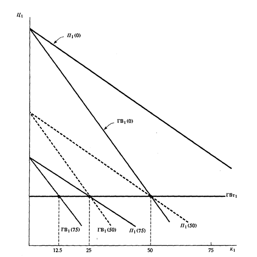 Тепер, прирівнюючи ГВ1 до нуля (граничні витрати фірми) і розв'язуючи рівняння для К1 , ми визначаємо: