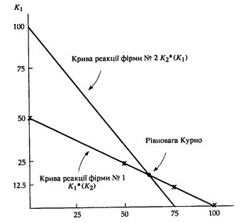На мал. 1.3 показано криві рівноваги Курно та точку рівноваги Курно. Зауважте, що крива фірми № 1 показує її обсяг виробництва в показниках обсягу виробництва фірми № 2. Подібно крива фірми № 2 показує К2 в показниках К1 . (Оскільки фірми є ідентичними, обидві криві мають однакову форму. Вони мають різний вигляд, оскільки одна з них задає К1 в показниках К2 , а інша виражає К2 в показниках К1 ). Точка рівноваги Курно перебуває на перетині двох кривих. В цій точці кожна фірма максимізує свій власний прибуток, знаючи обсяг виробництва свого конкурента.